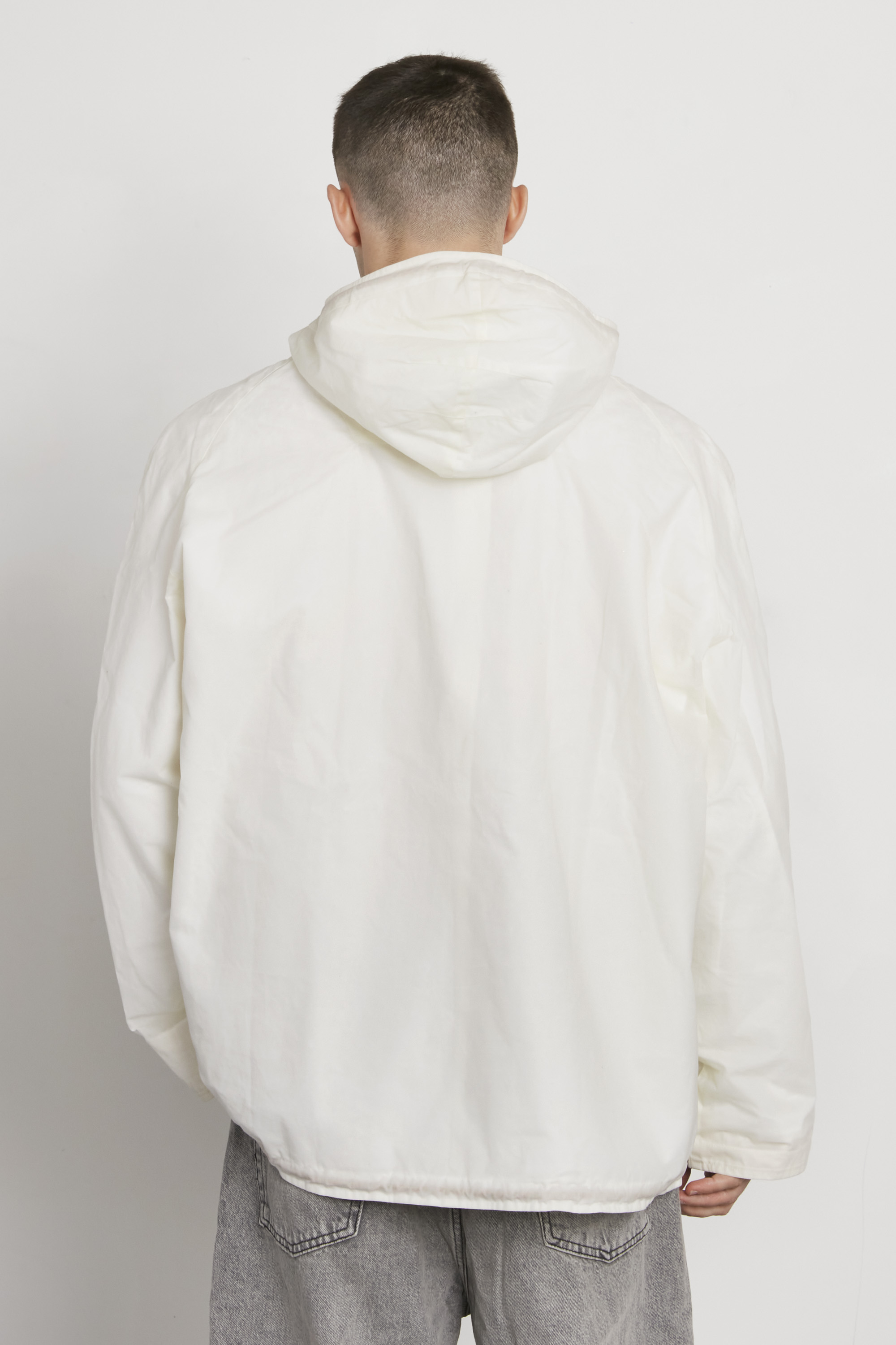This waxed cotton garment can not be washed. The white surface will pick up marks over time. Due to the extreme sensitivity to marks, we can not guarantee that the garment doesn’t pick up minor stains and lint during the manufacturing process. Worn in, this garment will have moulded to your body shape, with a specific patina – acting as a visual diary.